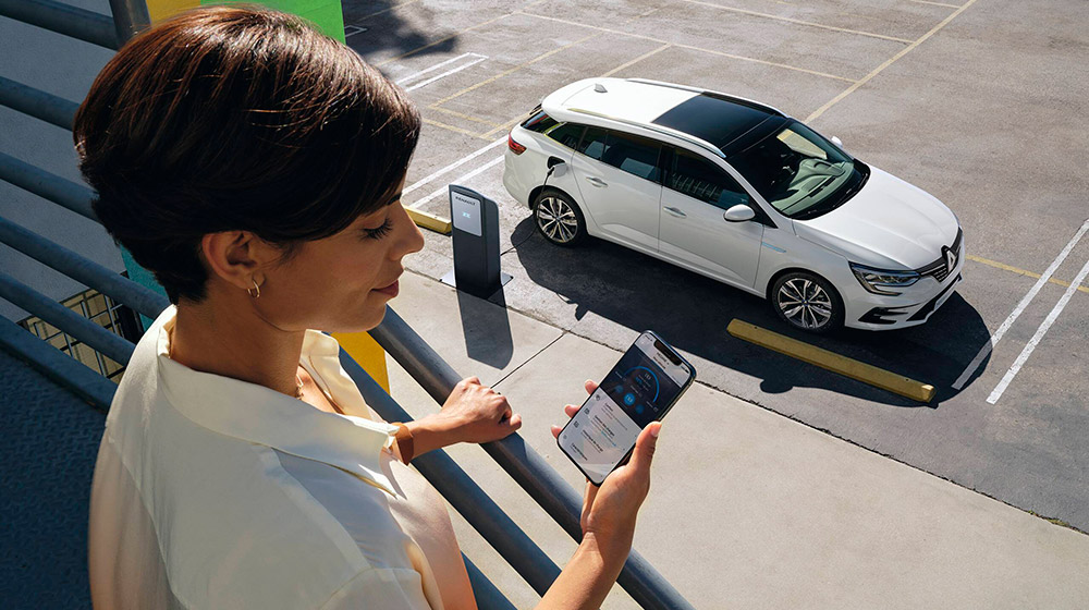 Inicie sessão no seu espaço MY Renault para consultar o nível de carga da sua bateria, programar o carregamento e pré-condicionar o habitáculo do seu Novo MEGANE Sport Tourer E-TECH Híbrido Plug-in à temperatura ideal através do seu smartphone..
