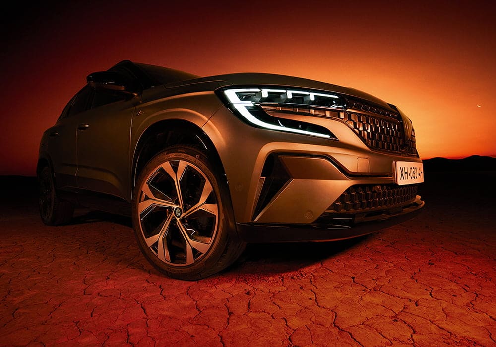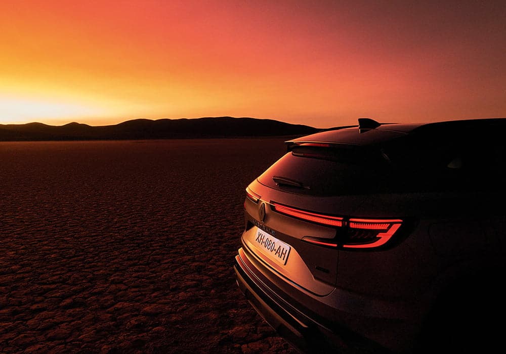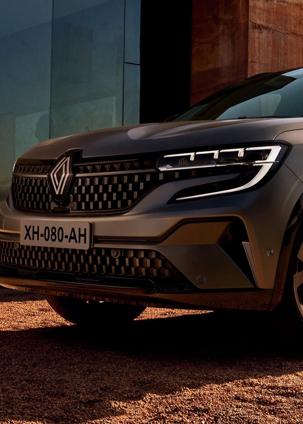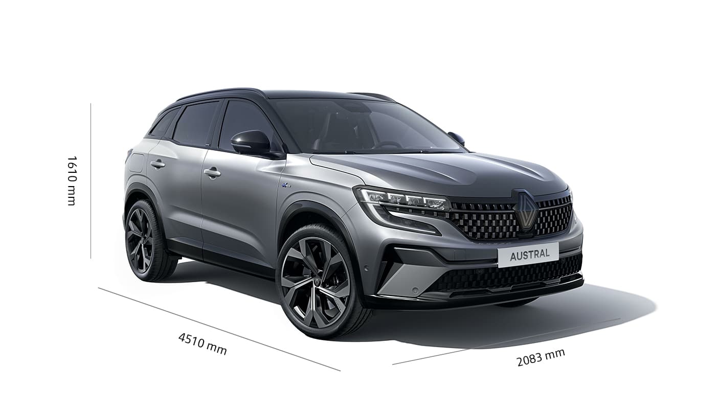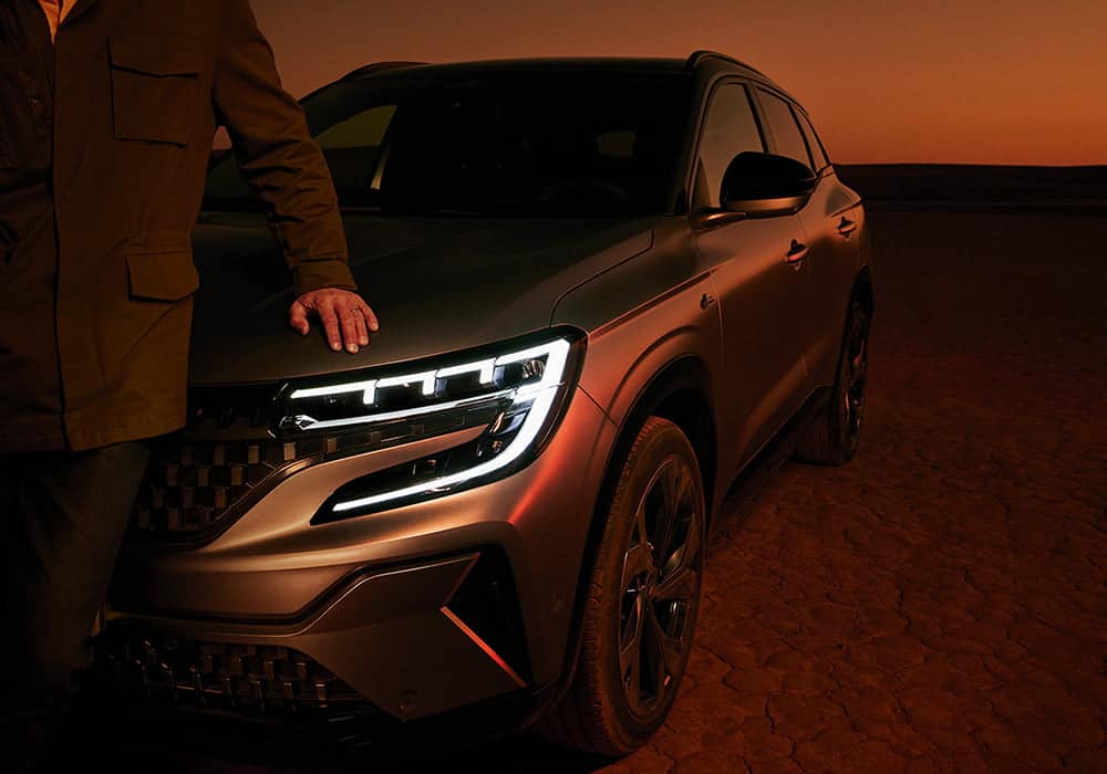 O Novo SUV Renault Austral E-Tech Híbrido é a elegância sobre rodas. Silhueta realçada pelo tejadilho brilhante e um corpo de proporções equilibradas com uma dianteira vigorosa, rasgada pela distinta assinatura luminosa Renault.